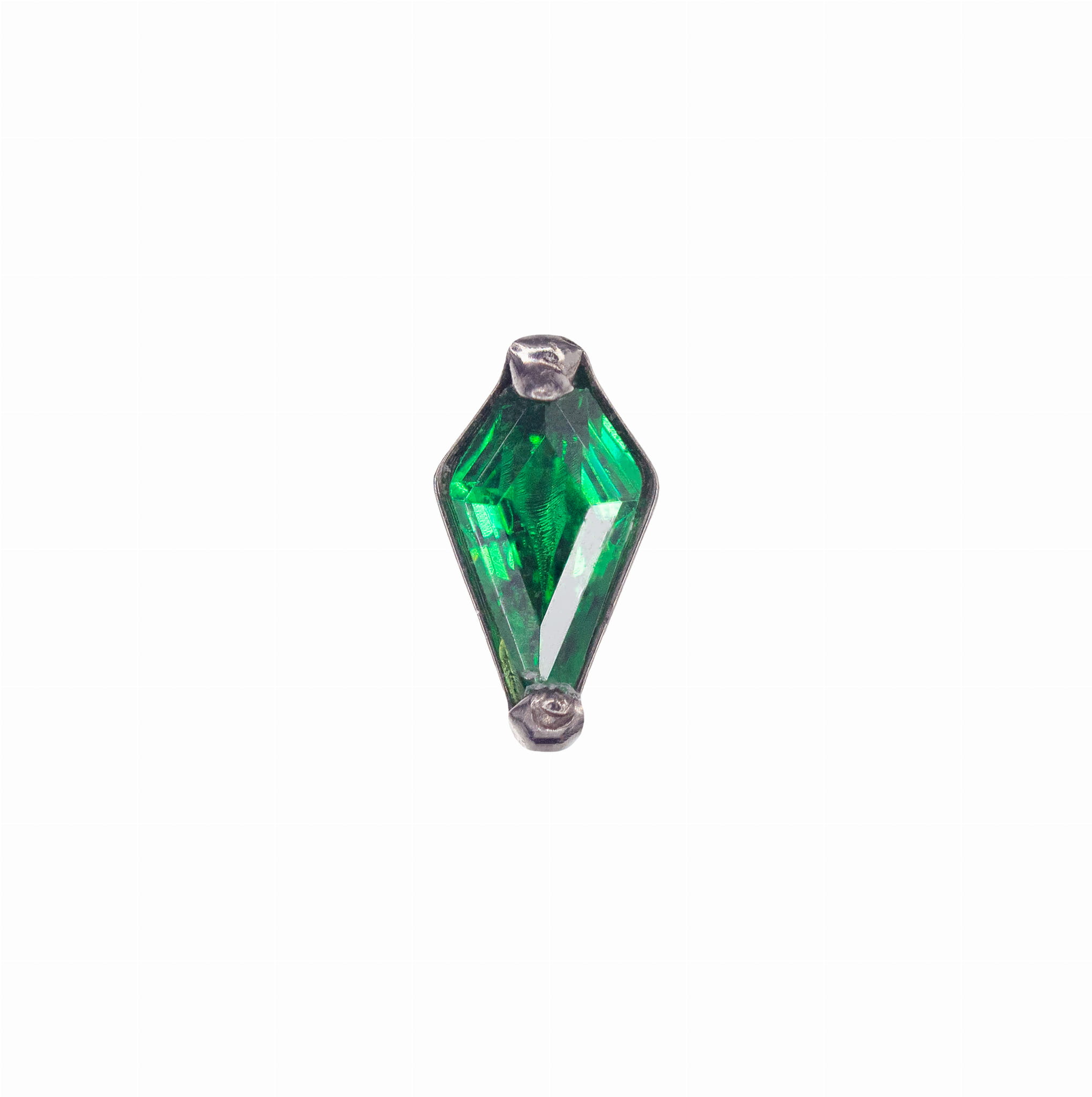 Drobna, kryształowa łezka cięta na deltoid. Wyglądem całość przypomina trumnę.