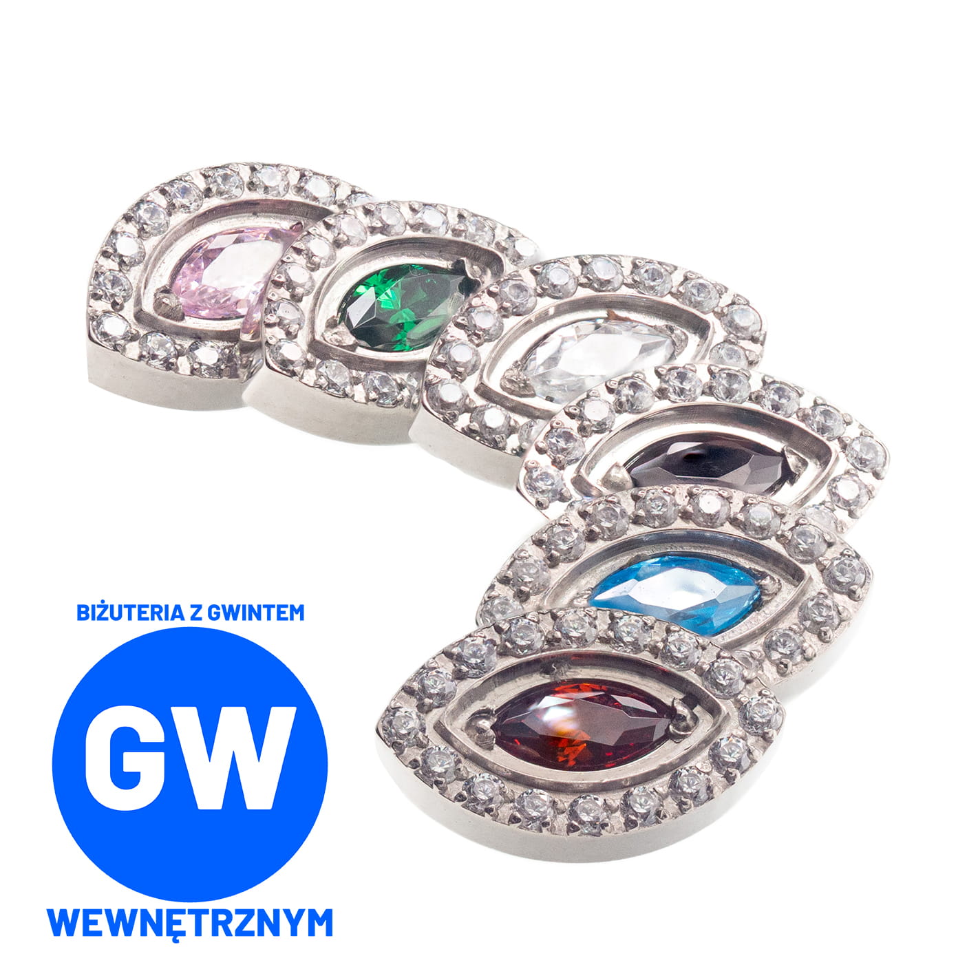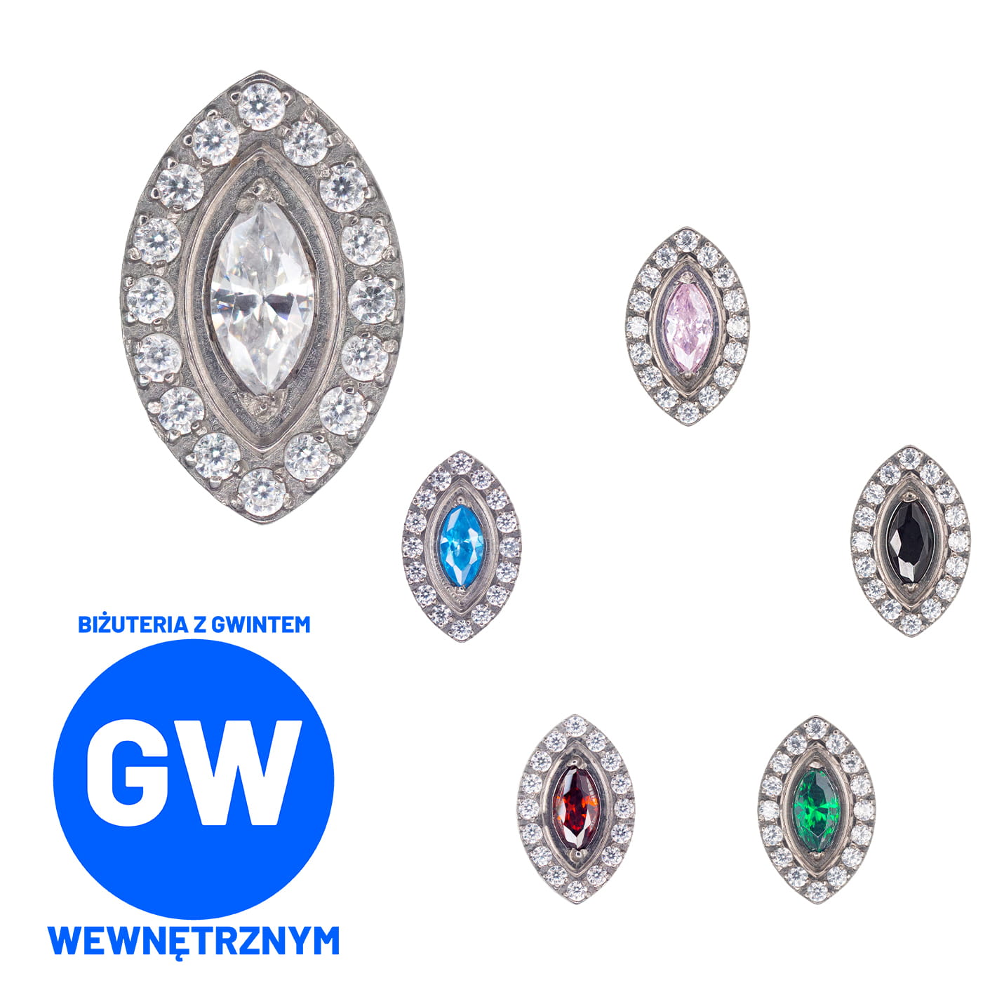 Biżuteria ozdobna - duża markiza dostępna w wielu kolorach. Otaczające ją białe kryształy sprawiają, że ucho wygląda zadziwiająco. Idealnie nada się do przekłucia conch czy flat.