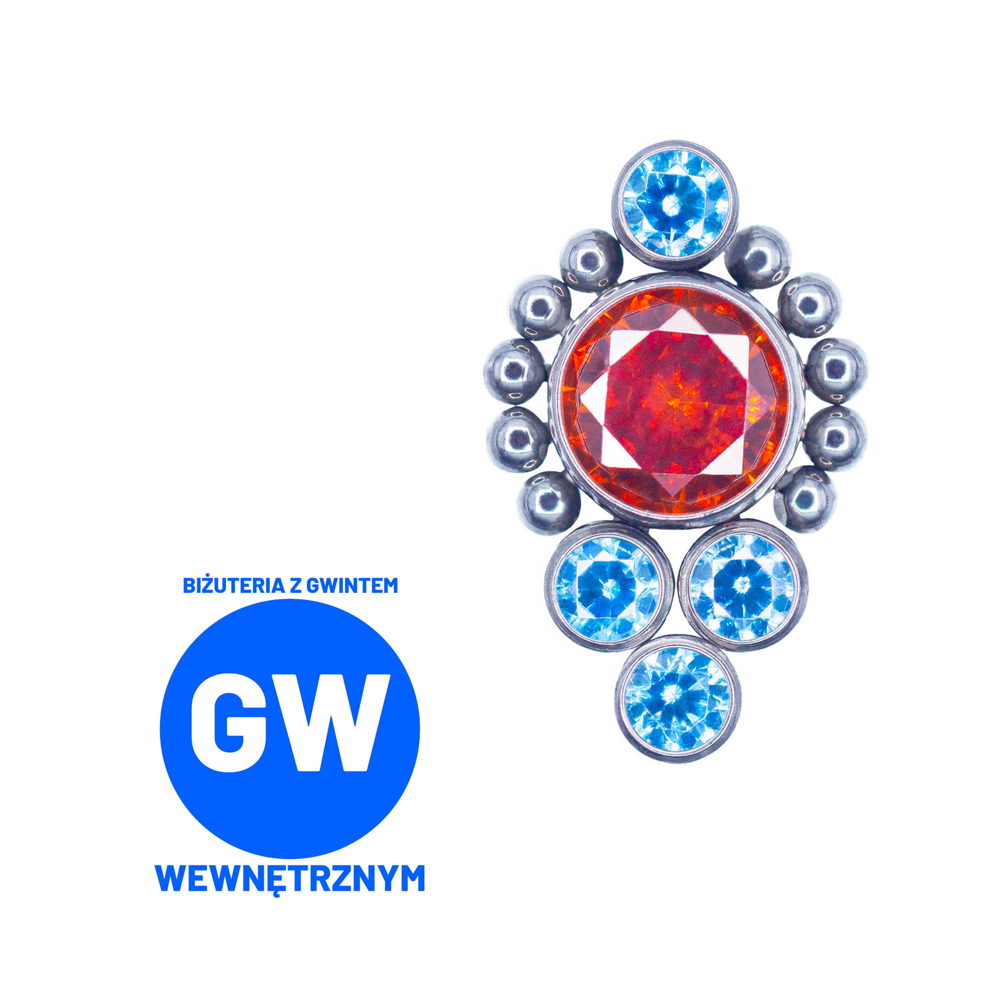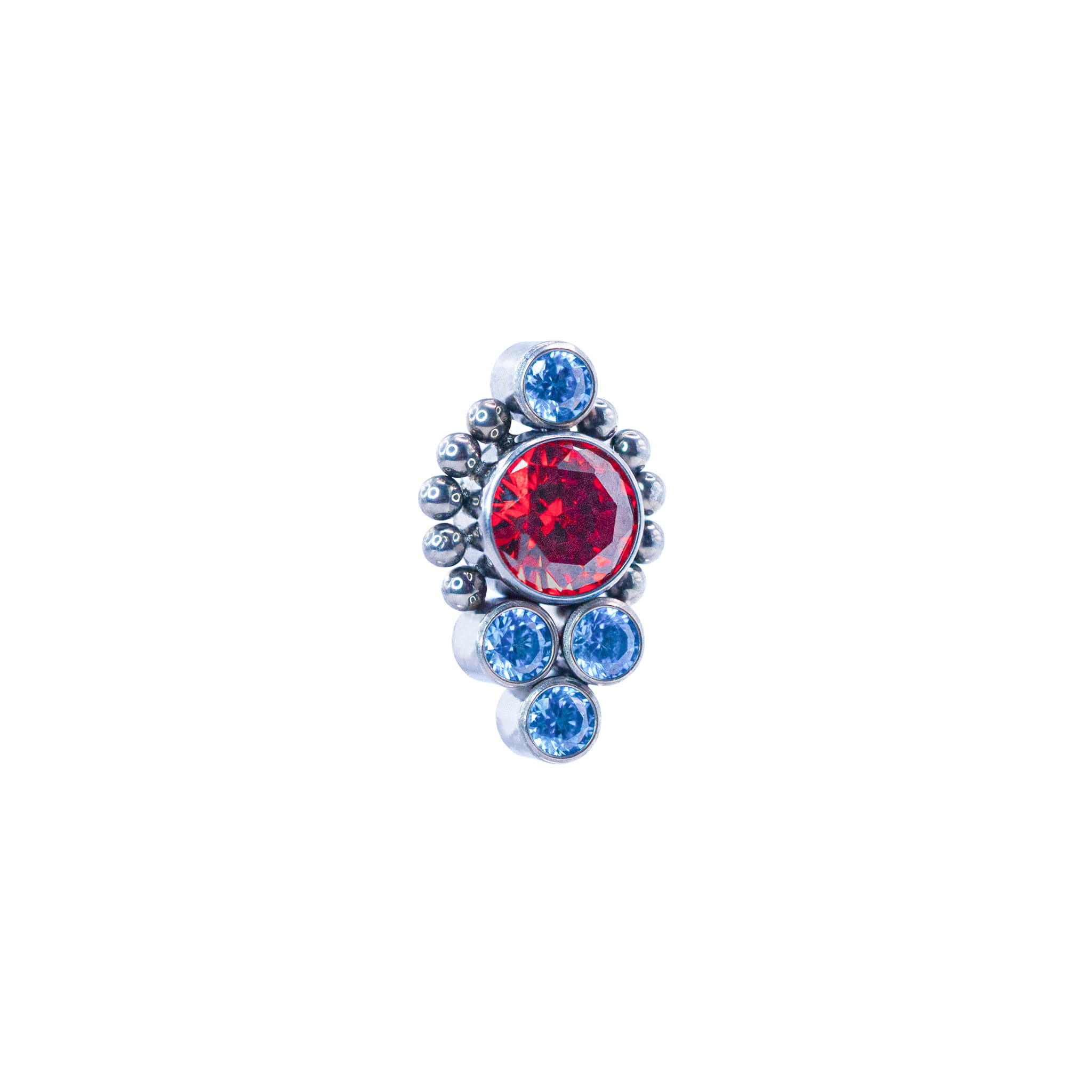Duża ozdoba z czerwonym i niebieskimi kryształami - tytanowy ozdobny labret