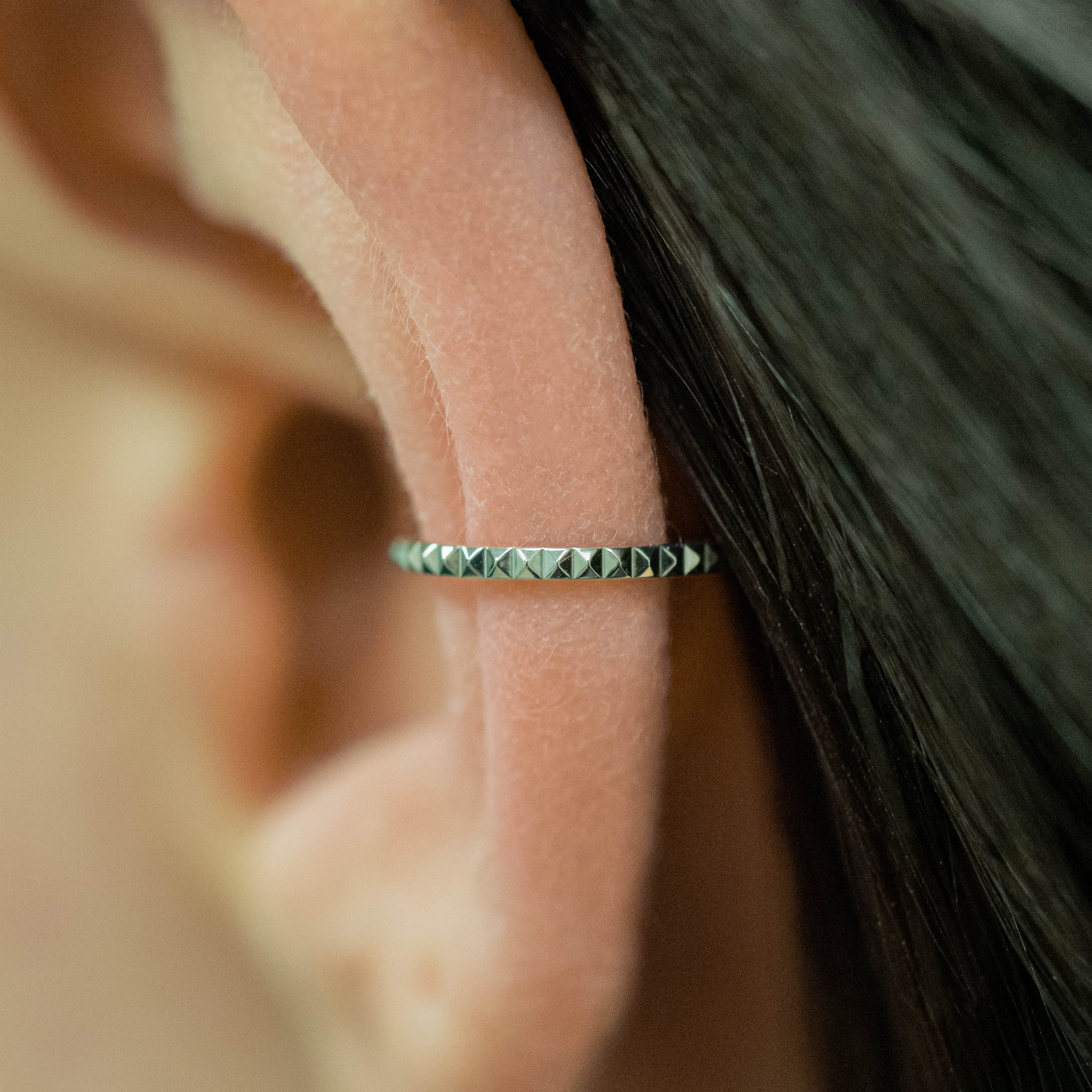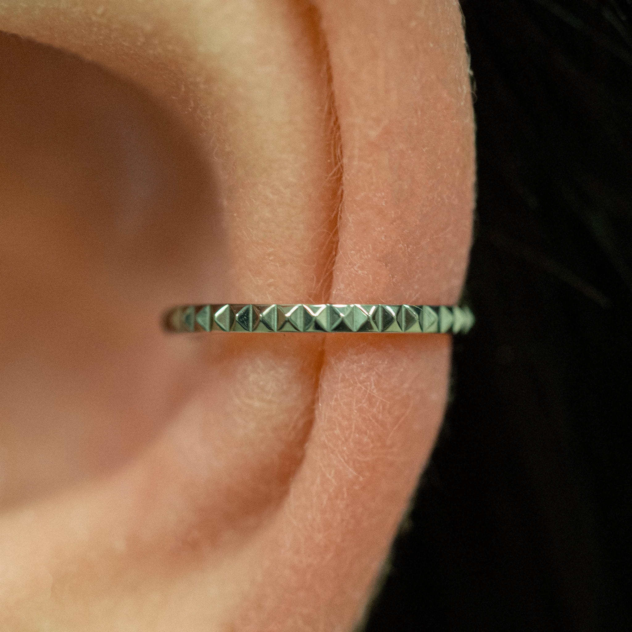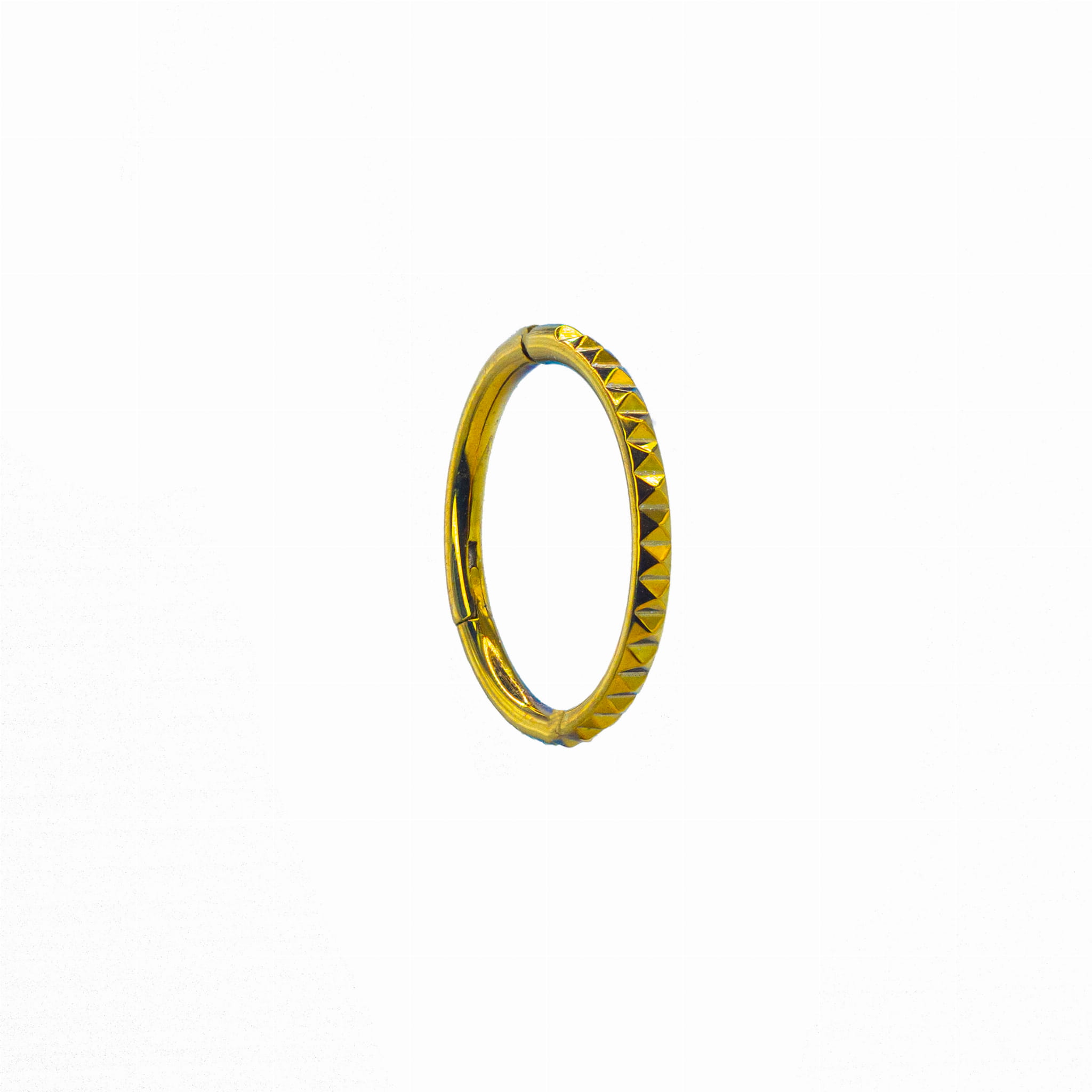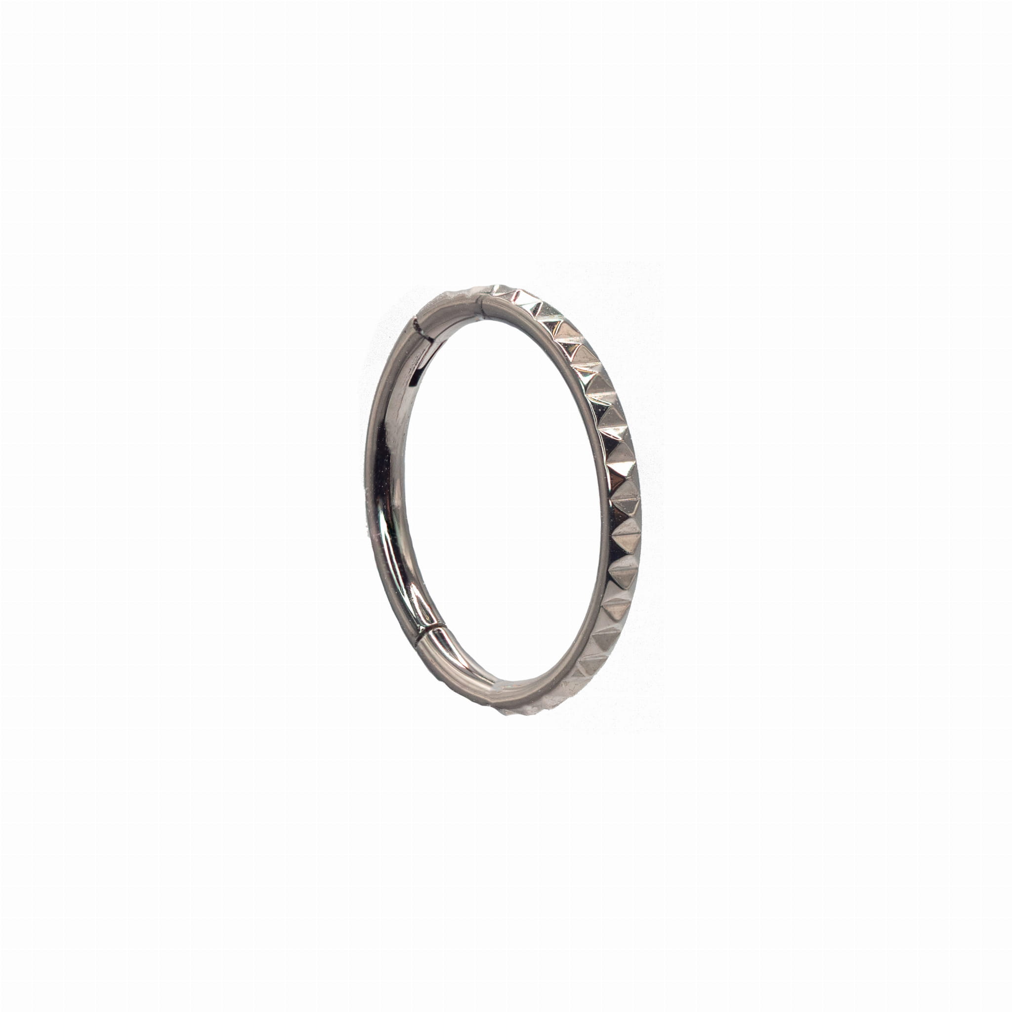 Klasyczny i delkatny clicker wzbogacony o liczne nacięcia tworzące w kształt piramidek. Clicker jest zeszlifowany, przez co cała biżuteria jest gładka i swobodnie może obracać się w kanale przekłucia - nacięcia są równe na linii całej obręczy. Majstersztyk!
