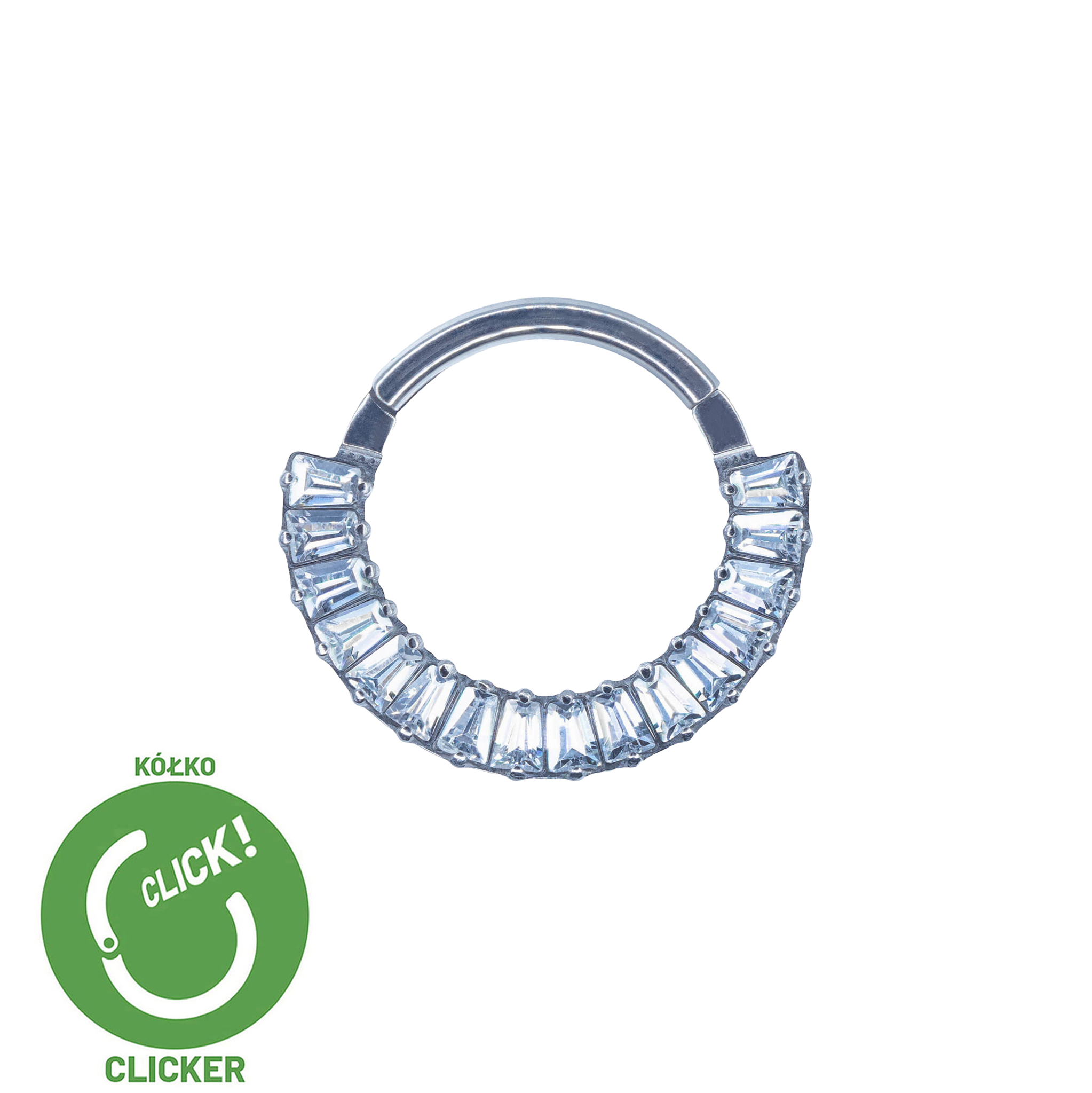 Clicker pasujący idealnie do daith lub septum z racji na umiejscowienia kryształów. Kryształy są podłużne i odgrywają główną rolę w całej biżuterii. Mocno zaznaczy przekłute septum lub przekłucie migrenowe na środku ucha. Absolutny sztos!