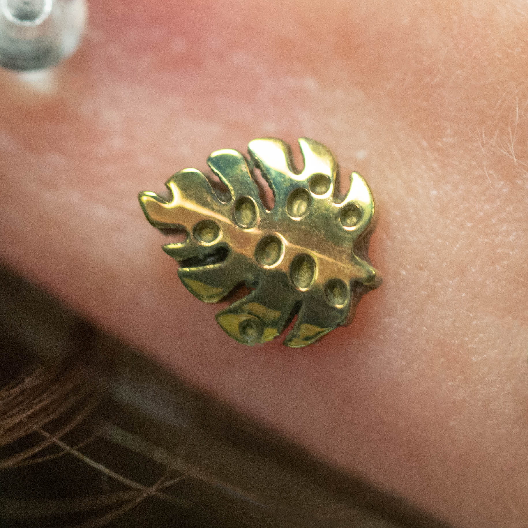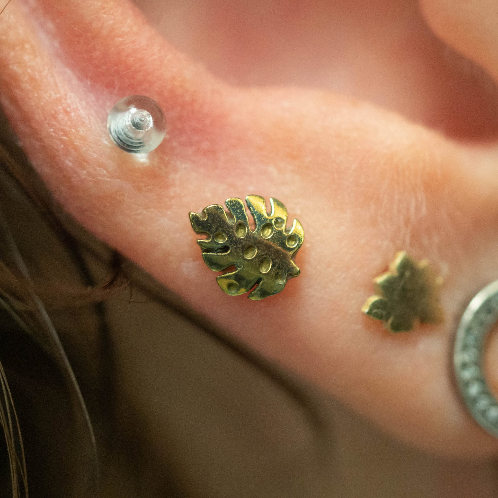 Kolczyk do ucha w kształcie liścia monstery. Idealnie pasuje do płatka ucha, flata lub głębszego helixa.